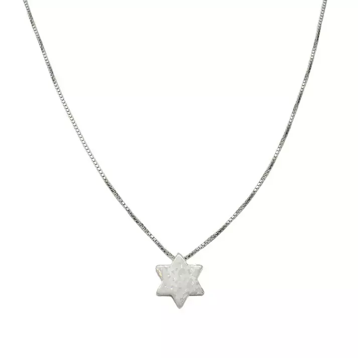 The neck pendant chain that we offer is made of high quality silver, guaranteeing durability and elegance. The opaline pendant, with its design inspired by Magen David, is a symbol of protection and spiritual connection in Jewish culture.